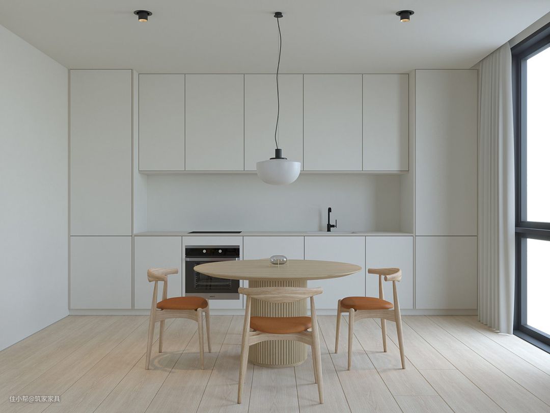 韦格纳风格的肘椅和圆形餐桌构成了一个极简主义的餐厅。