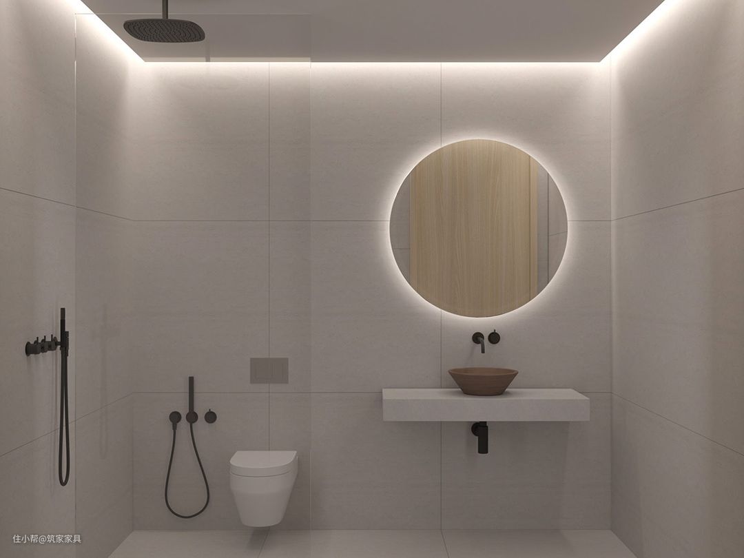 白色的浴室从上到脚都铺着瓷砖。黑色的装置穿过苍白的背景。