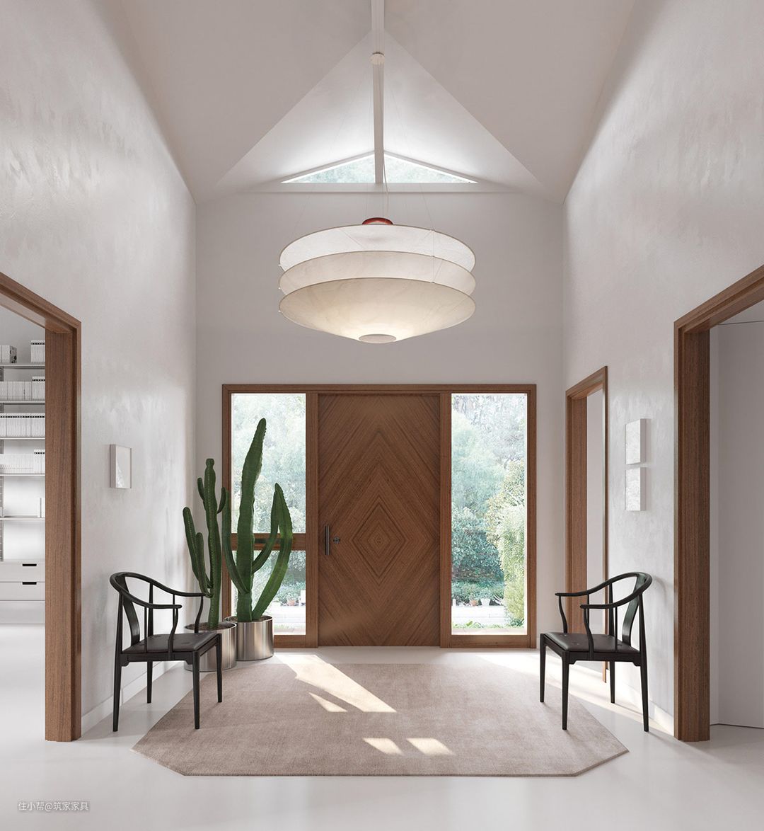 白色的墙壁呈现出简单的门厅设计,而前门上令人惊叹的钻石纹理则抢尽风头。炫酷的分层吊灯设计是中世纪美学的代名词,有助于将视线吸引到三角形天窗上。