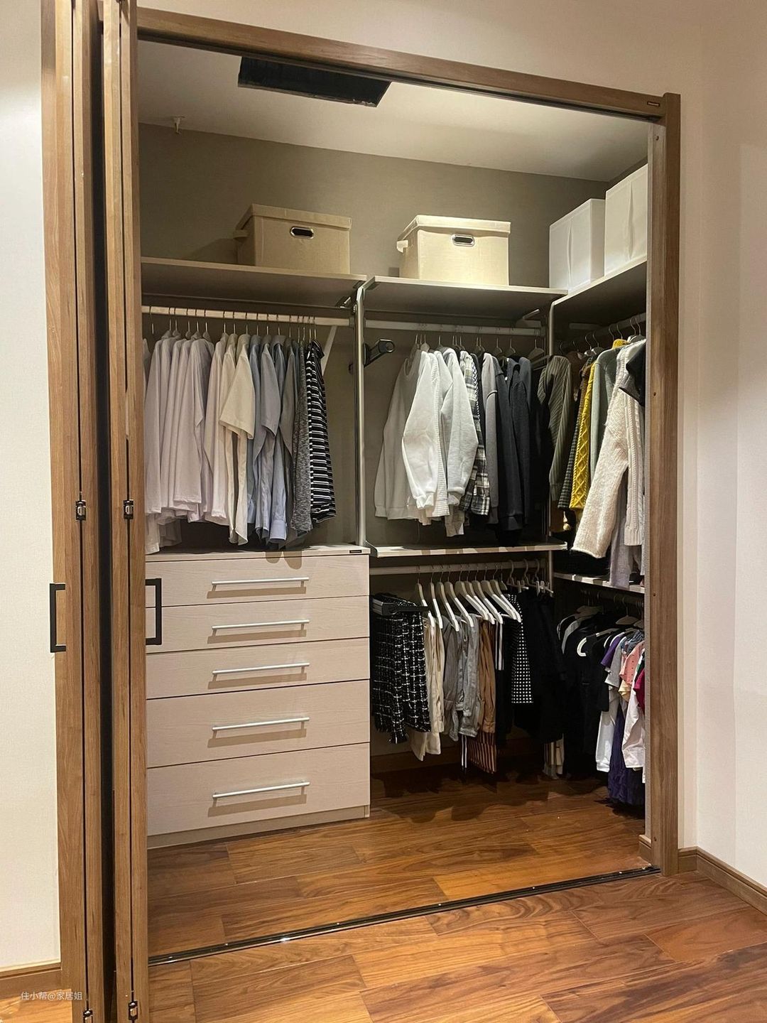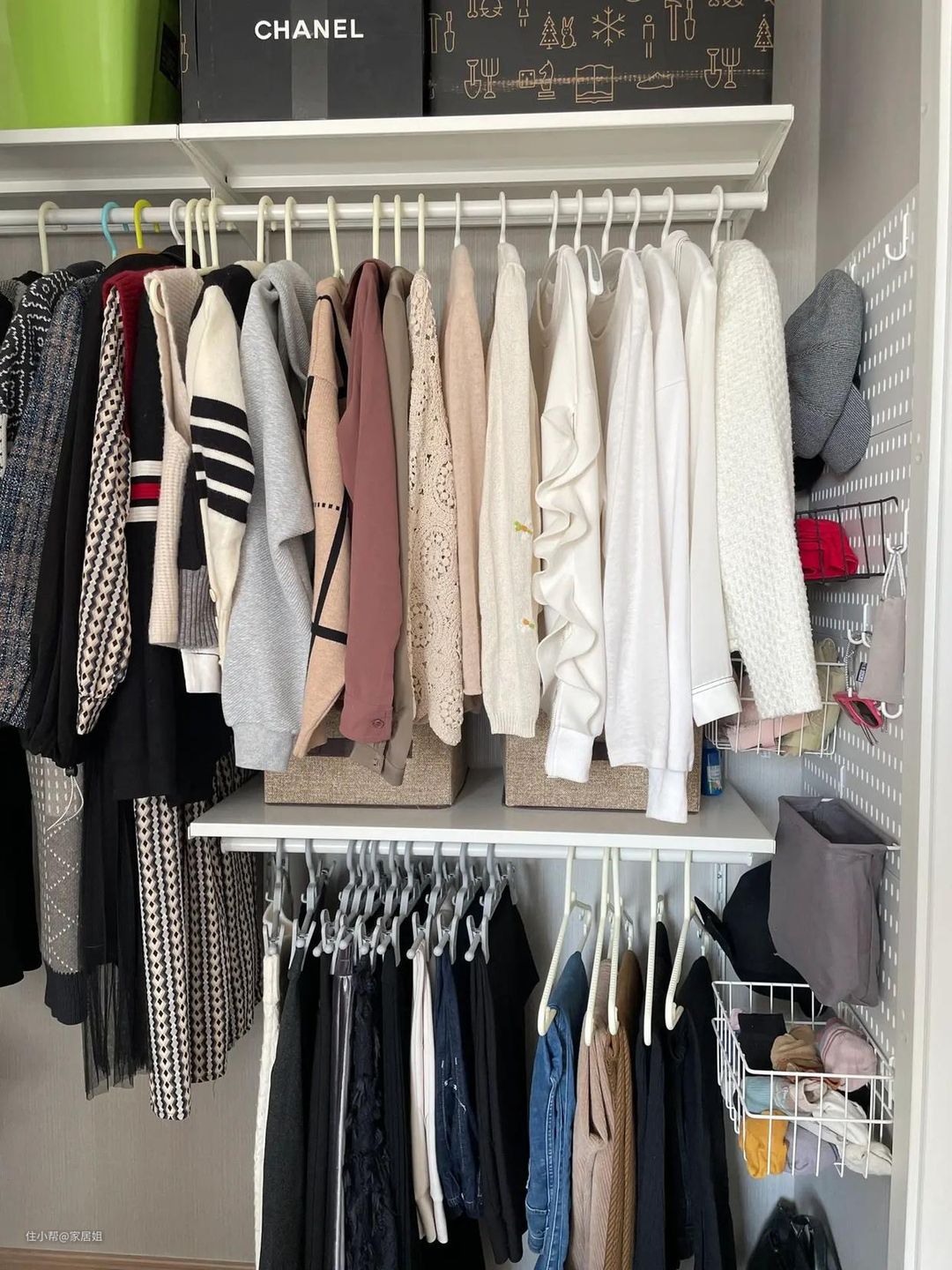 这样整理后的衣橱看起来整洁干净多了,虽然老公永远找不到自己的领带袜子在哪,但自己却能一清二楚。