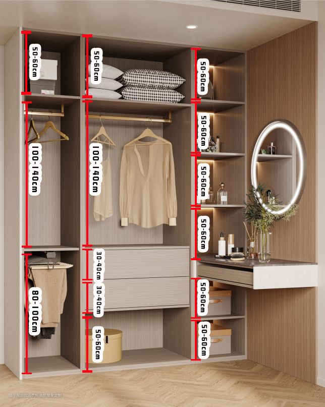 - 衣柜一般分为上、中、下三个区域,每个区域都有不同的储存需求。上部区域可用于放置季节性少穿的衣物和箱子,高度大约在50-60厘米之间;中部区域适合挂放日常常穿的衣物,高度大约在100-140厘米之间;下部区域适合放置鞋子、袜子和抽屉等小物品,高度大约在30-40厘米之间。