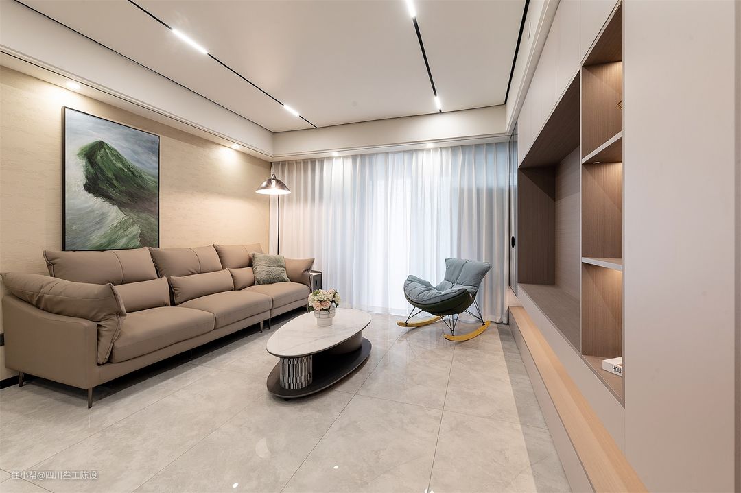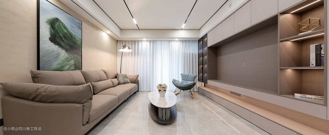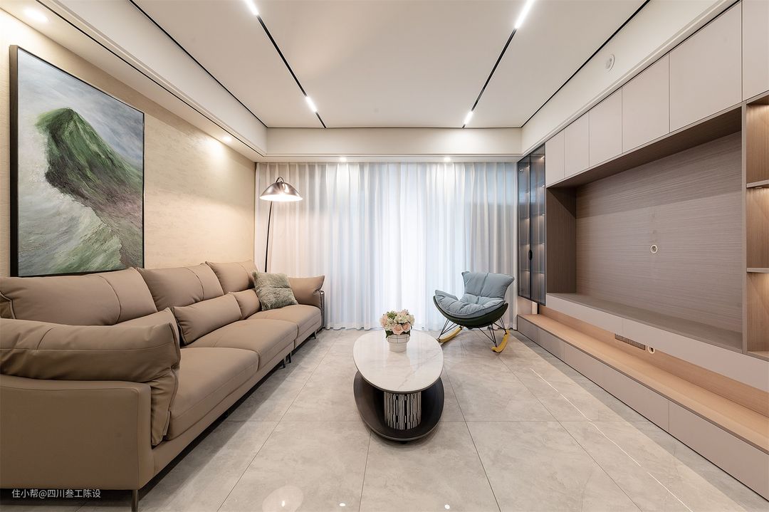自然采光不行,设计师通过灯光的利用同样可以提升空间的明亮度,顶部无主灯设计,两条磁吸轨道灯灯光亮度高,光线柔和不刺眼,沙发上方的边吊还做了辅助灯,整体光照强,不显压抑。