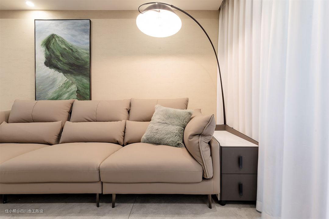 右侧的空间没有浪费,放了一个小巧简洁的斗柜增加收纳,后面还有落地灯增加照明,营造温馨氛围,将空间利用率提高,不浪费一点空间。