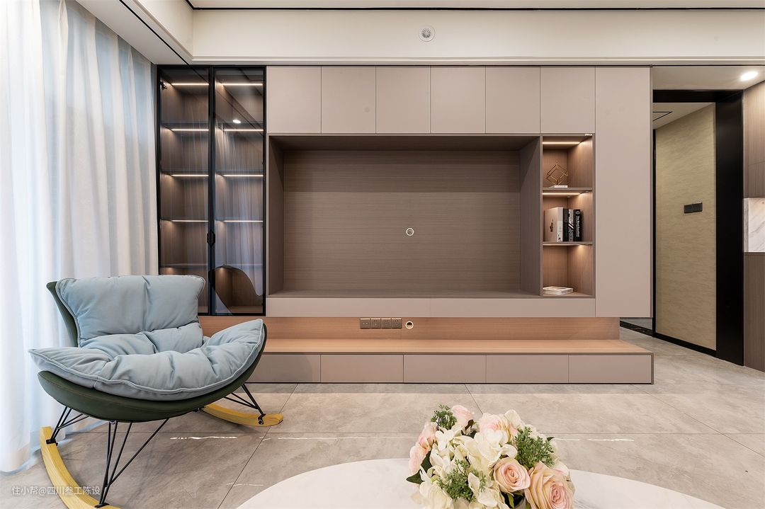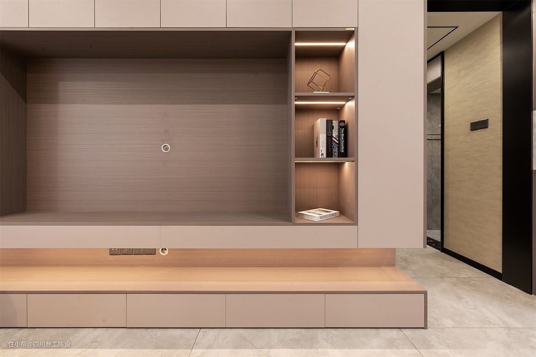左侧留出了空间做陈列柜,方便业主放置一些摆件与手办,中间的灯带增加层次与照明,同时也营造出了大气质感与品质氛围,更能体现户主对生活品质的追求。