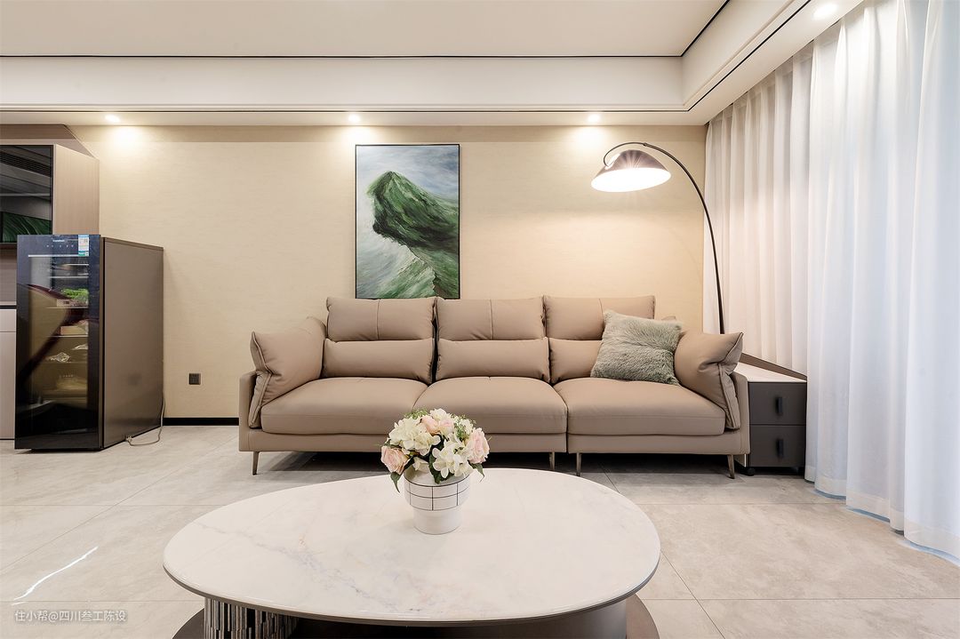 地面采用浅灰色的瓷砖通铺,尺寸适中,光泽度不高,更适合小户型,视觉上显得干净许多,和吊顶、灯光一起营造了一个简洁大气的客厅空间,清洁起来也方便。