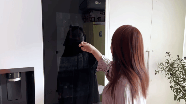 其次冰箱上半部分的右侧,带个超大的敲一敲窗口。日常摆放时,这里是一块隐藏式玻璃面板,用手敲一敲后,里面的照明灯就会被点亮,成为一个可视橱窗。