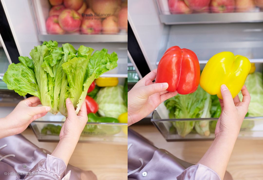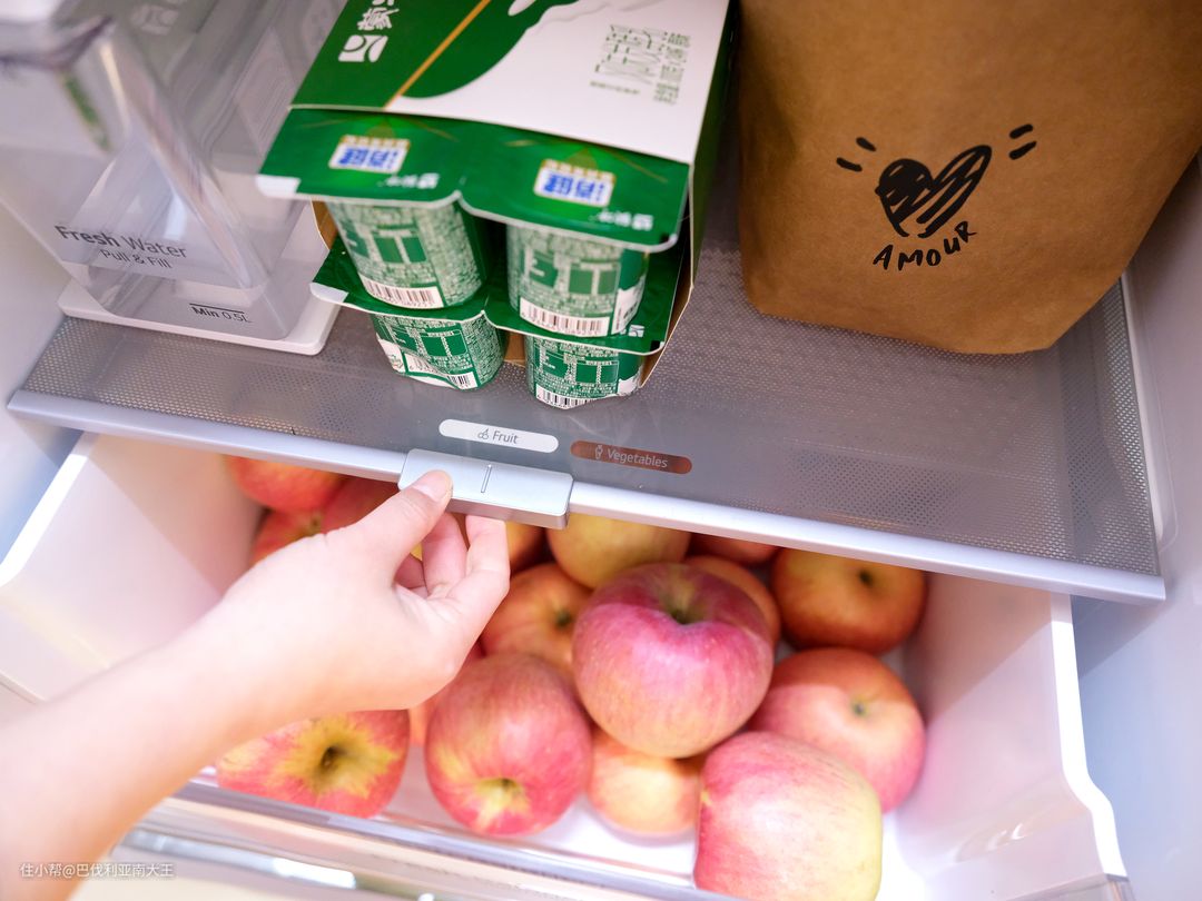 最下方的果蔬抽屉容量更大一些,能放下超多蔬菜水果,起到靠谱的保湿保鲜效果。比起果蔬放在普通冷藏室,这里能够延缓3-4天的湿水和变质进度,实测把绿叶蔬菜放在里面保存一周还是很新鲜。