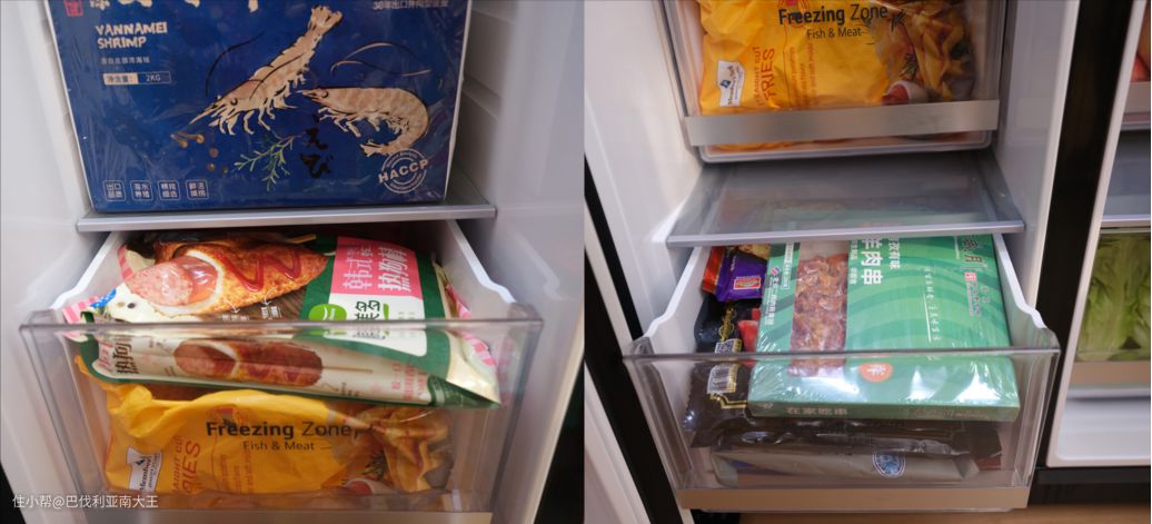 冷冻区下方则设计了两个独立的双组冷冻海鲜/肉类抽屉空间,采用了封闭式抽屉设计,方便分类存储,长期冷冻不串味。
