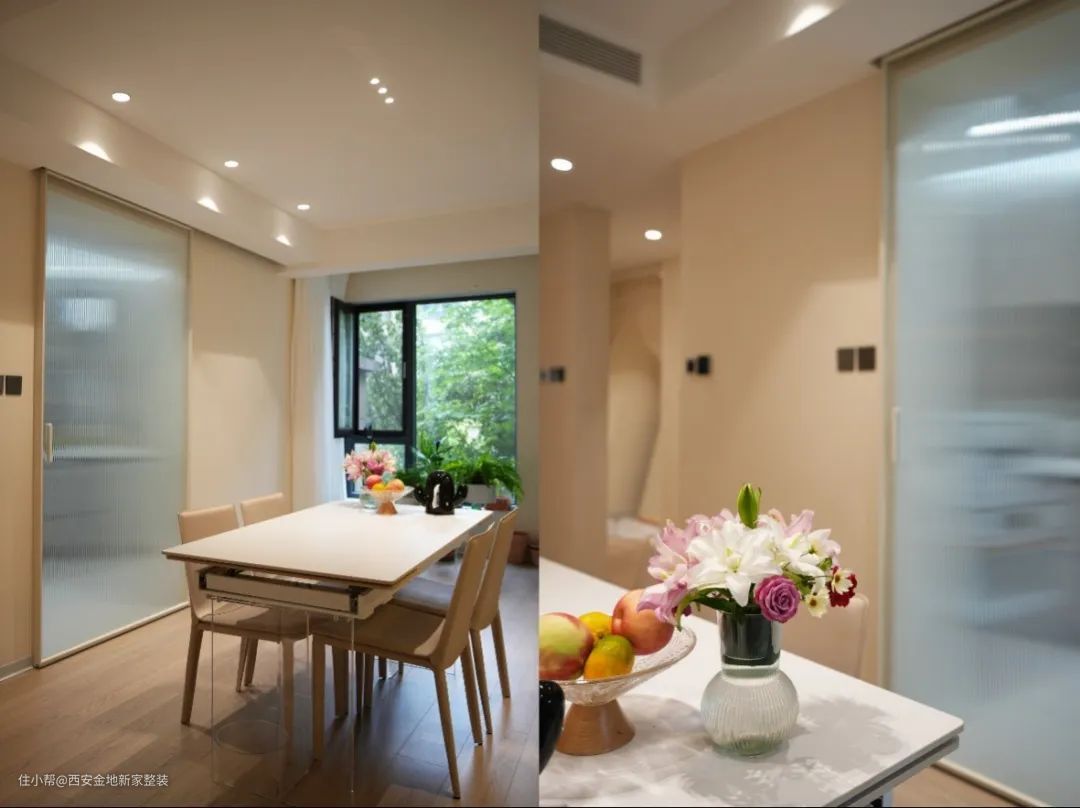 餐桌没有做过多的装饰,一旁做了与玄关同款色调的餐边柜,开放式的隔层区可供屋主他们摆放咖啡机,也能做水吧台使用。