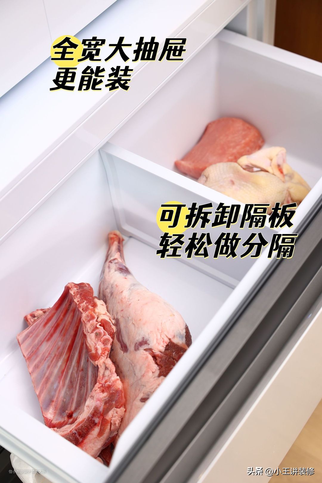 法式薄嵌T9的全宽直开大抽屉不仅容量超大,而且因为采用了三阶精钢导轨,具有超强的承重能力,抽拉顺滑,可以一拉到底,就算放了整只的鸡鸭、羊腿等,抽屉也是稳当不晃动的,这也是我很喜欢的一点。另外,它还在上层的冷冻抽屉增加了可拆卸抽屉隔板设计,最底部冷冻层则配有浅层托盘,当我们放置多种食材的时候就可以进行分类储存,更加方便有序。