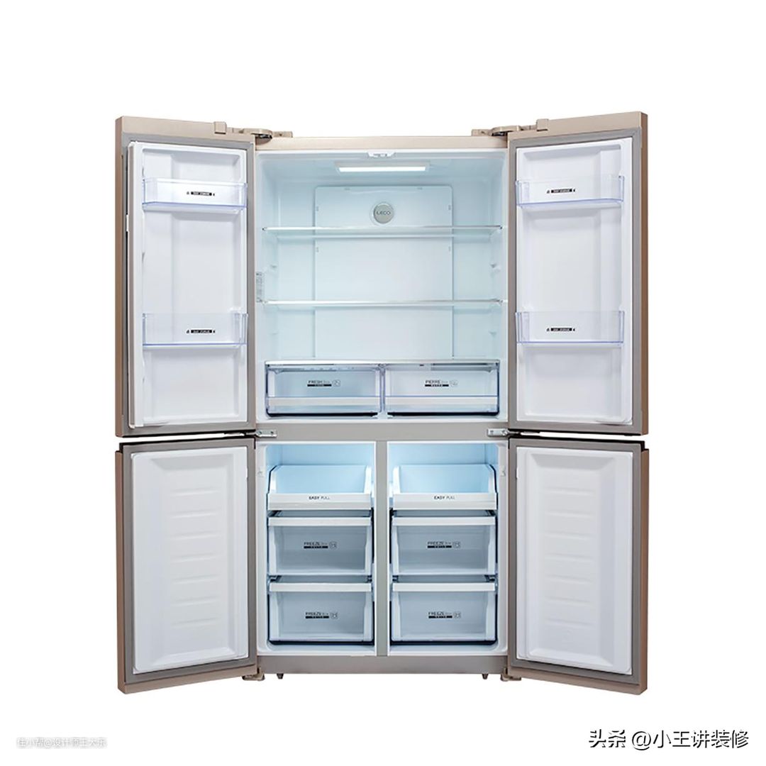 十字对开门冰箱有四个门,将空间划分成3个独立的区域,除了基本的冷冻区和冷藏区,有的十字门冰箱还将右下方设置为宽幅变温区。这种冰箱适合存放不同品类的食材,不过存放大体积食材时需要先切块分装好,比如整鹅、羊排、帝王蟹等等,否则很难放进去。