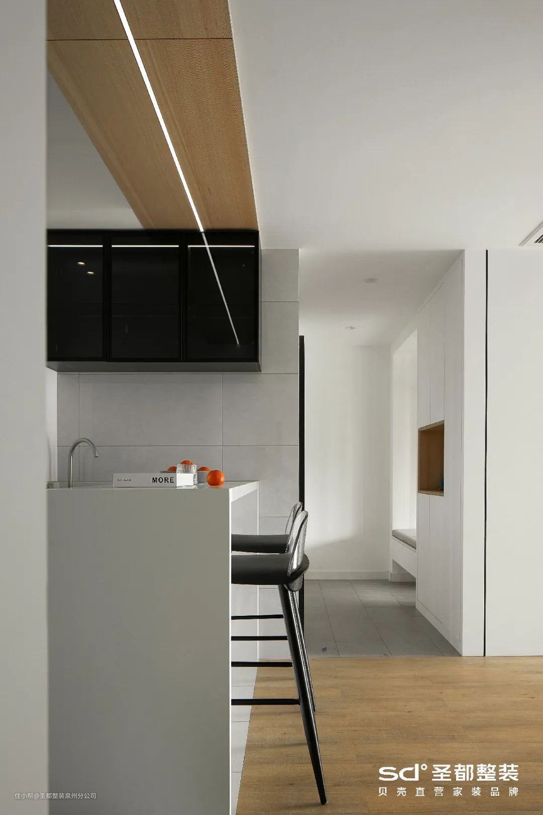 餐厅安置上中岛吧台,再配上水池,一个简易的西厨区就诞生了。