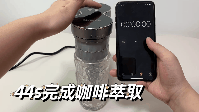 苏泊尔出咖啡的速度也非常快,从开始萃取到萃取完成一杯意式浓缩所需的时间只需要44秒,跟净水器水龙头出水的速度差不多,减少了等待的时间。