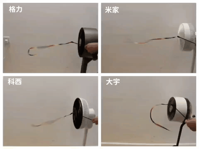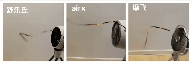 空气循环扇的一大特点就是可以实现室内的空气循环,要达到整室的空气循环的效果,则要求送风距离要足够长,长到可以接触更多的环境面。在这七款空气循环扇中,airx F4的的送风距离是长达18m,大面积的房间也可快速实现空气循环。除此之外,其他款空气循环风扇的送风距离也都是高达6m及以上,基本普通家庭都可以完成很好效果的空气循环。 由于家里没有专业测试风距的仪器,所以下面我在测评上使用了彩带来测试它们出风的稳定性! 出风距离: