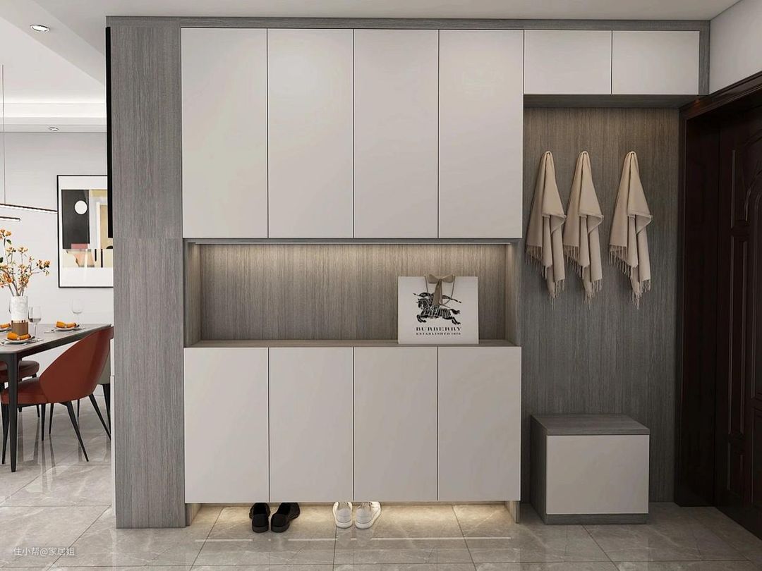 虽然薄但也拥有很大的储物空间,鞋子竖着放不进,可以横着放,进门处留了挂衣区,让空间有个缓冲,用来挂出门的衣服包包也很实用美观。