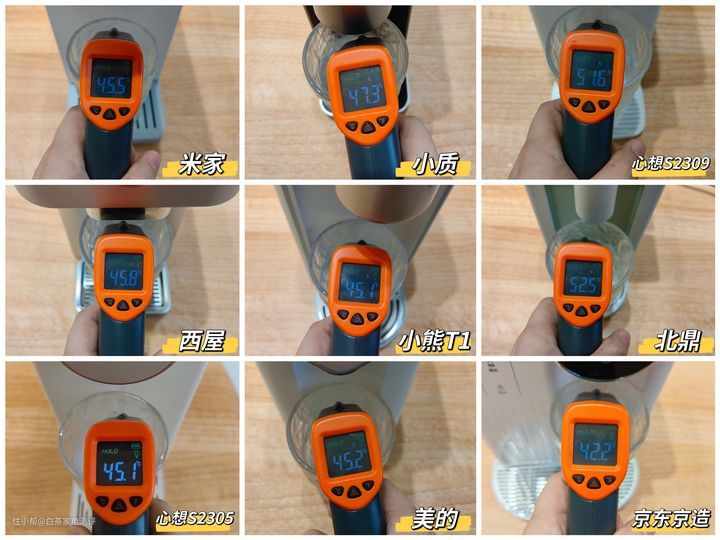 可以看到,小熊YSJ-E20T1和心想S2305只有0.1℃的温差,这个其实在口感上根本感觉不到。美的和米家也不错,可以控制在0.5℃。 北鼎S901和心想S2309的温差就有点大了。心想S2305和心想S2309虽然都是同一个品牌,但控温效果相差太大了,所以说咱们买家电不能一味追求大品牌,同一个品牌的不同产品也是存在差异的。