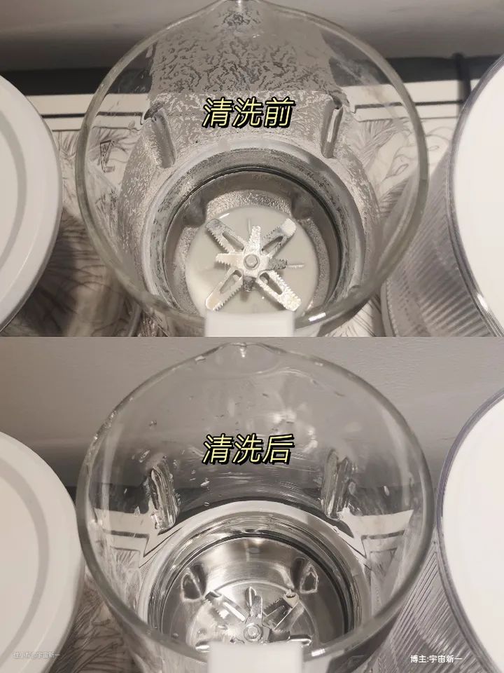 当蒸汽喷洒到一定容量后,它会进入快速搅拌程序。在搅拌的同时,还伴随着高温蒸汽,这样就形成了冲击力,彻底清洁杯体。这是清洗前和高温冲洗后的对比图,它可以把杯子洗得非常干净,像新的一样。而且冲洗操作也非常简单,只需要按下相应的按钮,破壁机就能自动完成清洁工作。