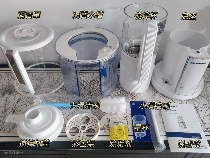 这款破壁机有个厚厚的隔音罩,这样工作时就不吵闹了;杯子和搅拌器是一体的,方便省力,杯体容量在冷饮最大1200ml,热饮最大1000ml,容量大的杯体完全足够3-5人饮用;底座是下沉式的,支撑很稳定;还有个隔音水槽,降低噪音;另外,还有杯盖、蒸蛋架、说明书和清洗工具,使用很方便。