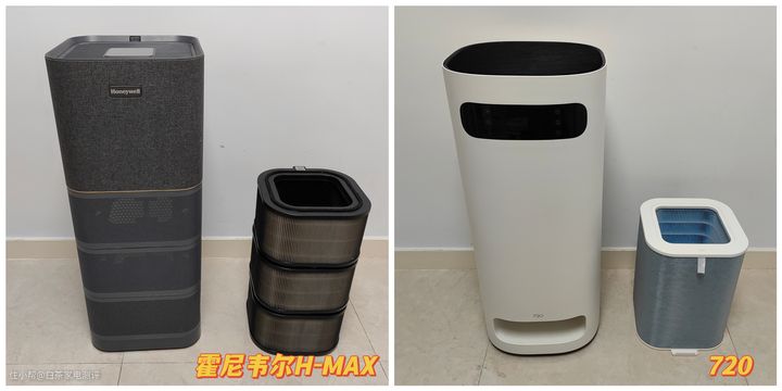 ➢ 柱式结构: 霍尼韦尔HMAX和720 S800的风道结构都是柱式结构,并且圆筒式设计还可以扩大与滤网的接触面积,滤网使用寿命也相对较长。不过,霍尼韦尔HMAX是四周360°进风的方式,而720 S800是三侧270度进风,两者相比,霍尼韦尔HMAX的进风面积会更大,净化效率会相对更高。