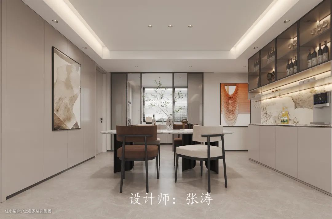独立的餐厅空间营造了静谧的就餐氛围,大理石餐桌采用经典的黑白搭配,棕色餐椅的点缀丰富了整个空间的色彩层次,抽象的装饰画增强了视觉美感。