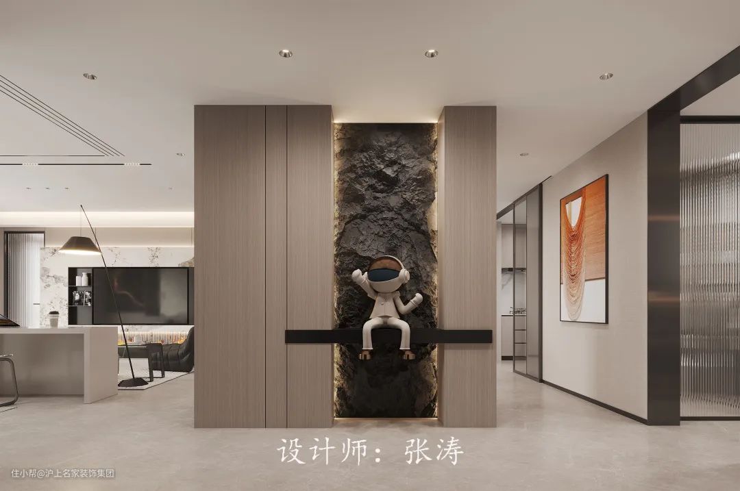 玄关处开阔的空间将不同的空间连接起来,整个区域宽敞明亮。木质柜体中间做镂空处理,黑色岩石造型展现细腻的纹路,极具时尚感的摆件居中放置,为单调的空间注入了几分活泼与生机,灯带的加饰更营造了温馨的家的氛围。