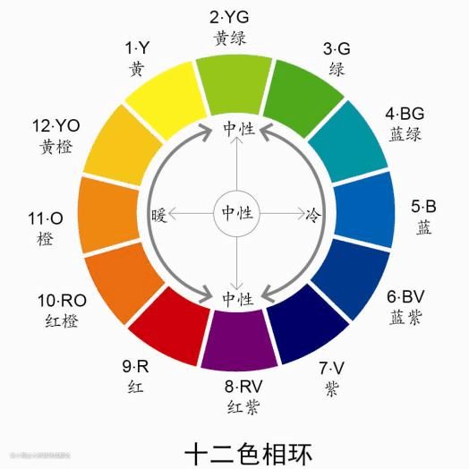 在色相环中夹角60°以内的两种颜色称为邻近色,如红色与红橙色,黄色与黄绿色均为邻近色。