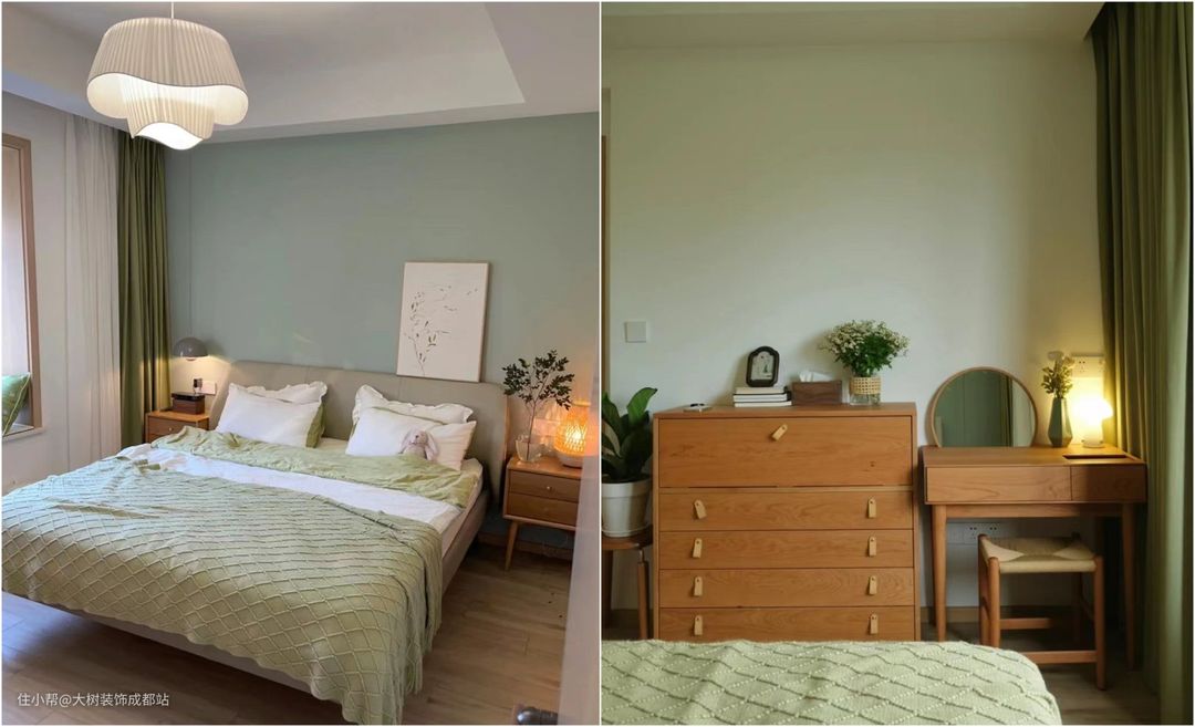 绿色用在卧室搭配中也比较常见。因其冷暖皆宜的色彩地位,和自带的自然属性,被认为有利于滋养身心。