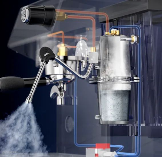 ④双锅炉:蒸汽锅炉和萃取锅炉完全独立,可以根据喜好和习惯来调节温度,储水量较大,连续出杯能力强,而且萃取温度控制精准,一般应用在高端咖啡机上。