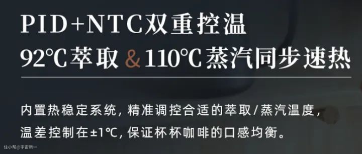 ④PID+NTC双重控温,能够精确调控合适的萃取和蒸汽温度,保证咖啡口感。