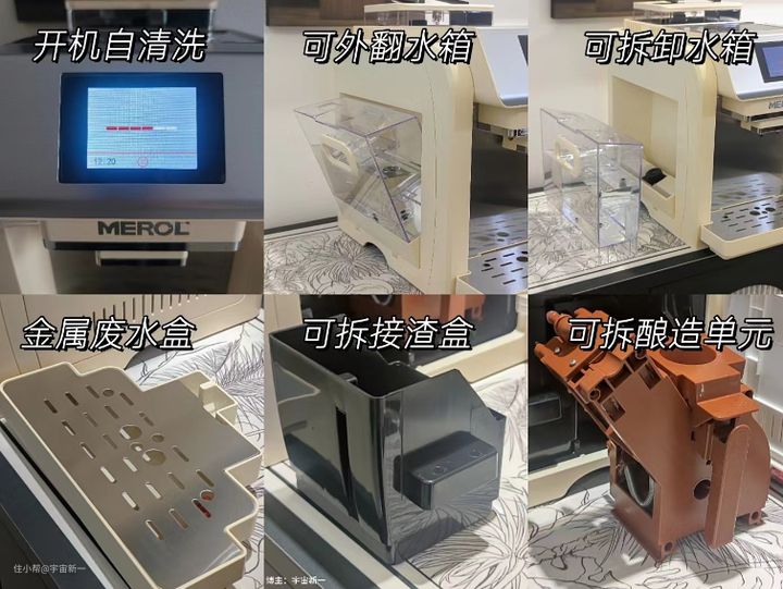 容易清洁:美宜侬ME-717全自动,咖啡机清洁很容易,每次开机会自动清洗管路,还有一键除垢功能,它的水箱、豆仓、酿造单元、接渣盒和废水盒都可以轻松拆洗,每天晚上制作完咖啡很轻松就能把咖啡机清洗好。