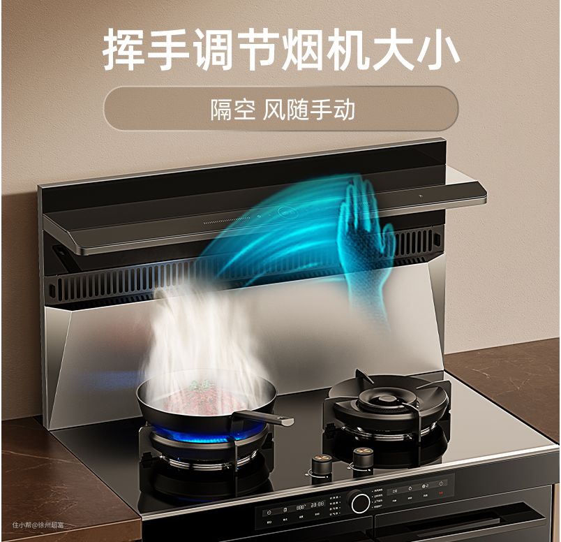 款侧吸式油烟机采用的是立体环吸,基本上可以完全覆盖住灶台台面的整个地方,四面八方不怕跑烟。回型的进风设计也使得无论从何处逸散的油烟都难以扩散。除此之外,这款吸油烟机的黑晶面板也十分美观大气。