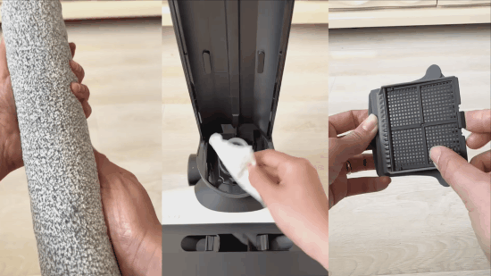 而添可的挤水刮条能实时保证紧贴滚刷,充分刮除水分、脏污和毛发,保证滚刷清爽干净。