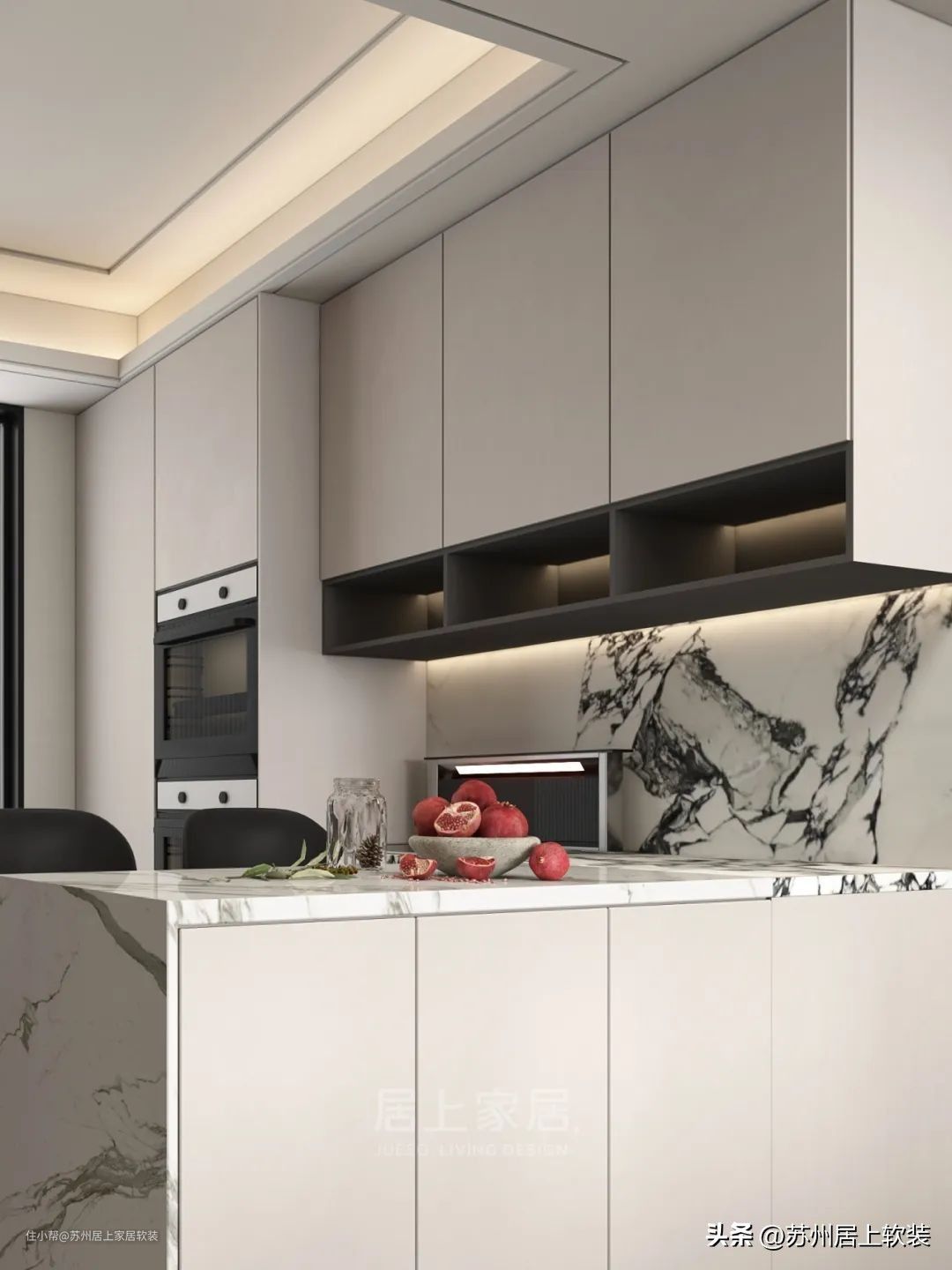 为了满足日常用餐的需要,设置了岛台餐桌和大面储物柜体,同时将柜体进行层次与结构的划分,使其满足日常生活的便利需求。