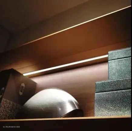 筒灯的聚光效果不错,光线向下,且柔和均匀,展示效果强。在筒灯光线的晕染下,柜子门板的质感、纹理光泽被凸显出来,柔和氛围也呈现出来了。