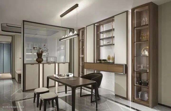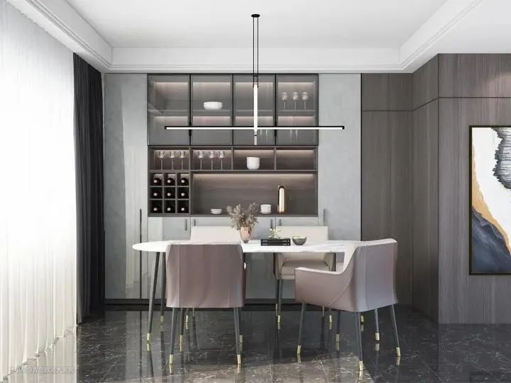 若是柜子整体呈现简约设计,那么最好是选择线条利落,几何感较强的吊灯款式,避免繁重的吊灯破坏和谐美感。