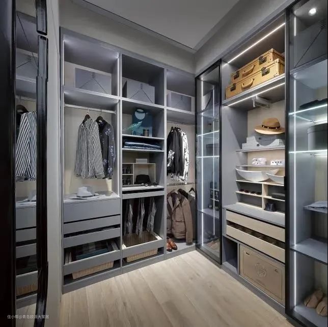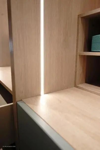 衣帽间同样是内嵌灯带常应用的区域。层板内嵌式的LED线形灯带,观感精致,更能体现空间的高级氛围。除了照明展示、解决视觉盲区的作用之外,带着柔和光晕的线条与柜身的纹理交织,也能弱化空间的封闭感。