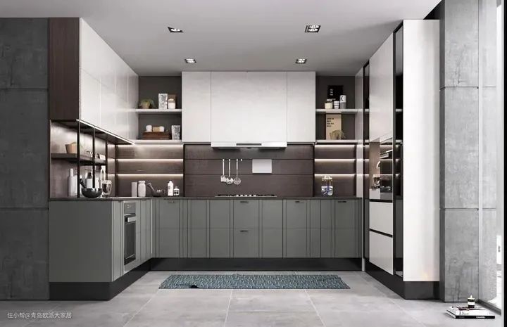 若是借助橱柜,沿墙面层板内嵌灯带,不仅能提高整体的温馨氛围,还能消除台面视觉盲区,照明充足,操作起来更加方便。
