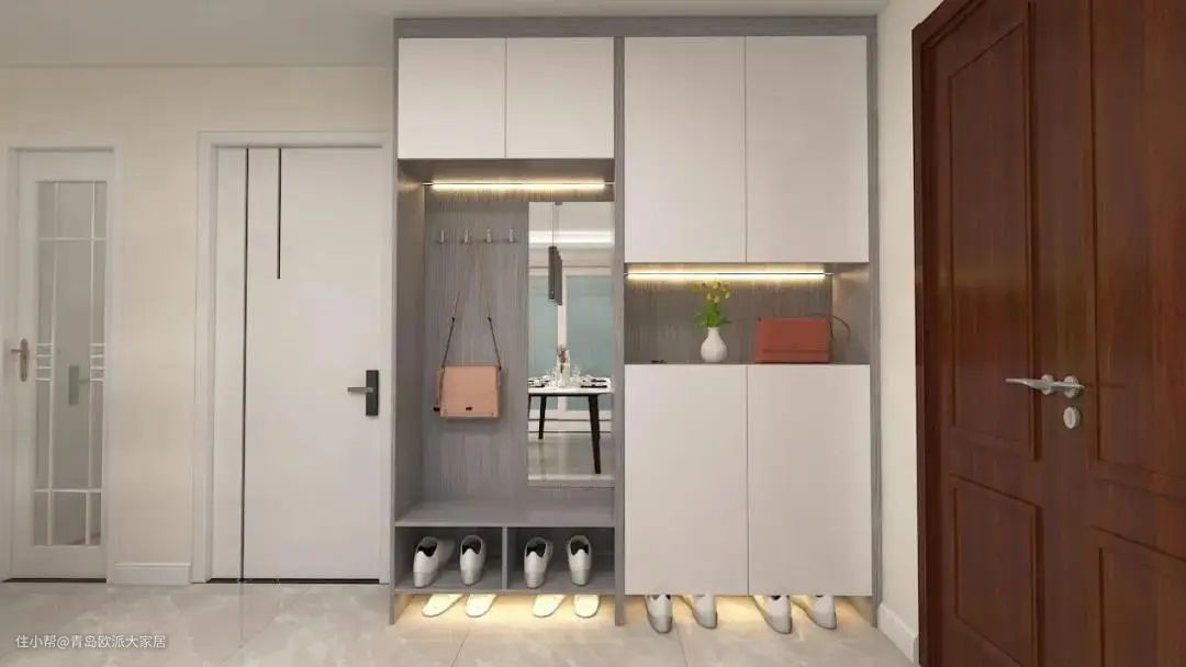 玄关柜底部留空的位置,是顶灯照顾不到的“死角”。设计感应内嵌灯带,随动随亮,再也不用回家摸黑找开关换鞋。