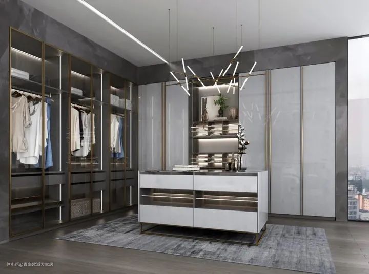 在下图案例中,衣柜的金属边框、超高拉手与内嵌灯光,组成空间中重要的线条元素。选择短簇金属质感吊灯做装饰,交错层次丰富,能将灯及柜子的造型魅力,发挥得更淋漓尽致。