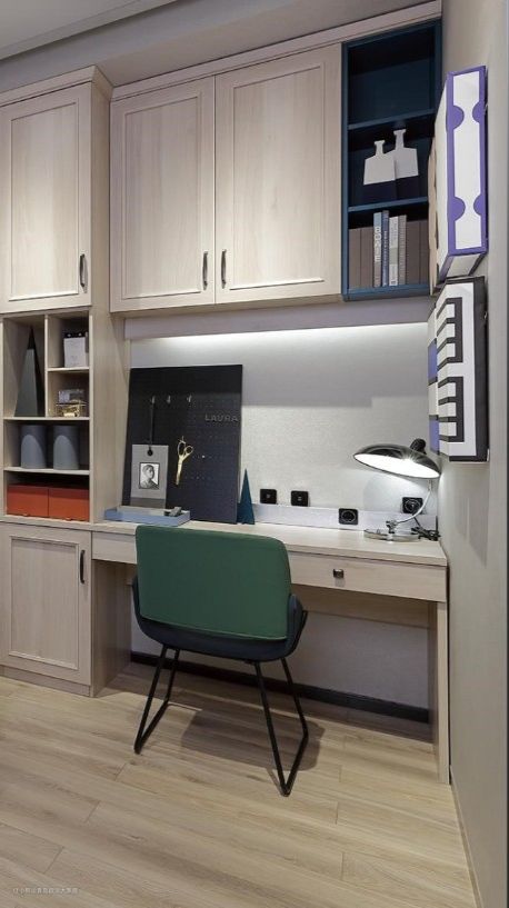 书房的台灯与卧室的不同,在色温的选择上,需要选择接近自然白光的偏冷色调,这样的光线显色性更强,阅读不累眼,注意力更专注。借组合柜的底部内嵌灯带,让整个阅读空间更加明亮。