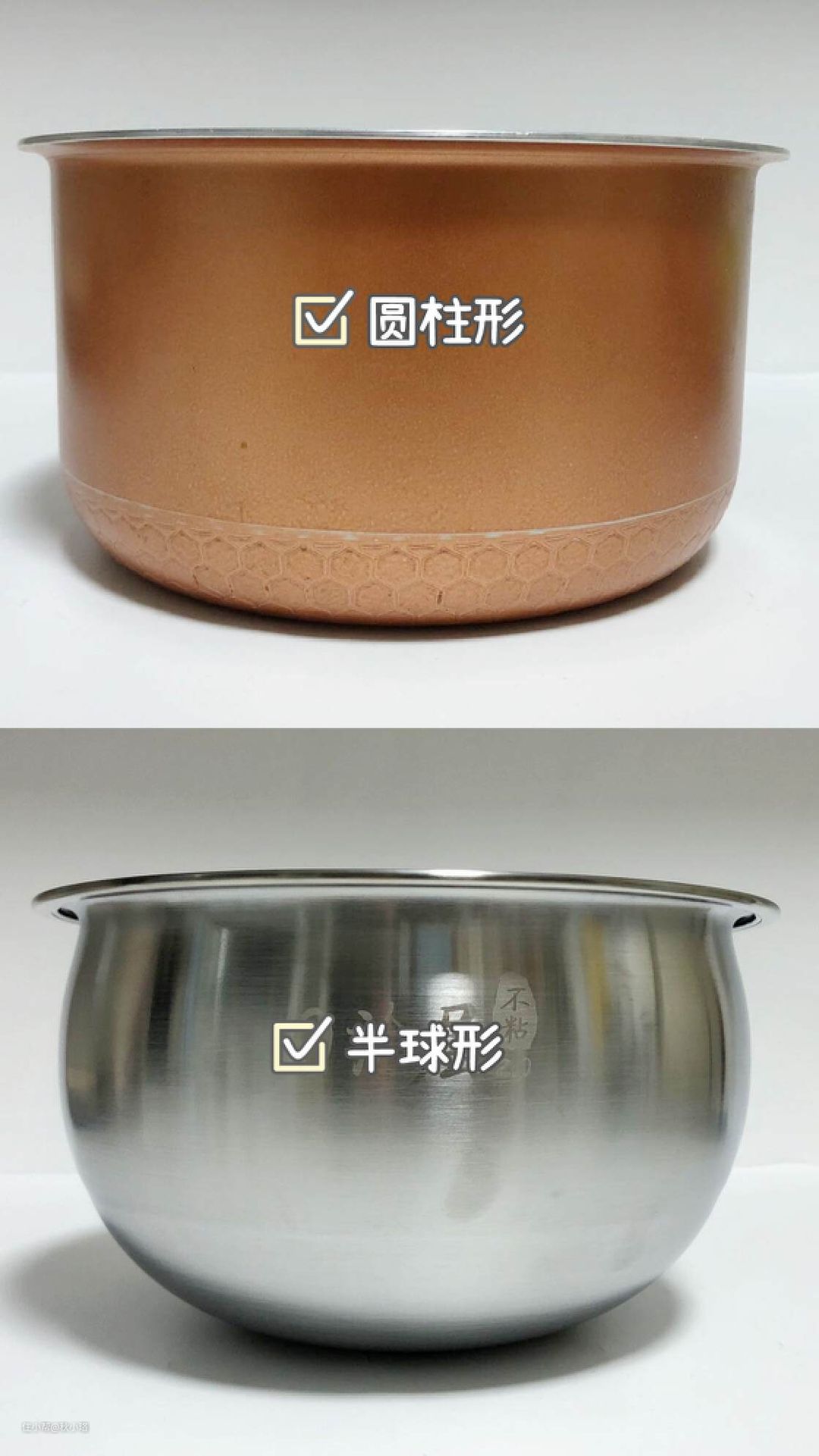内胆的形状会影响到电饭锅的传热速度和效果,一般内胆分为圆柱形和半球形(釜)两种。