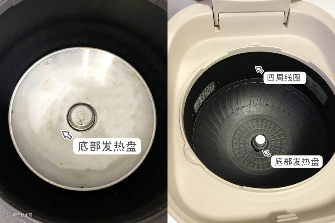 下图左边为底盘加热的电饭煲,右边为IH加热的电饭煲。