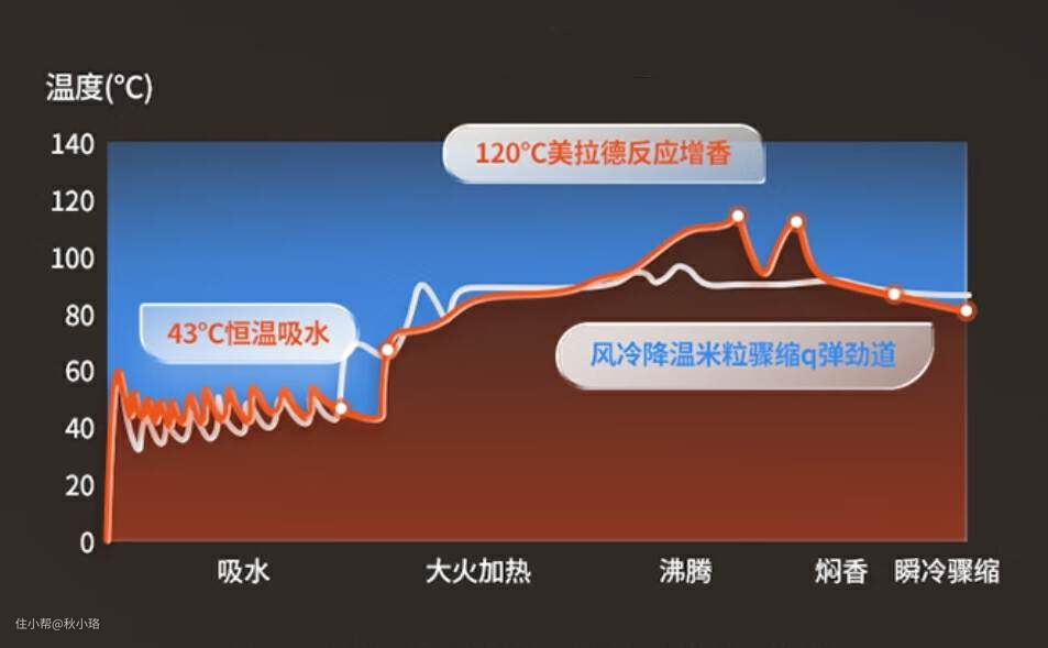 沸腾:锅内水温在98℃以上,大米深度吸水,同时被高温糊化,加上高温蒸汽,让米饭晶莹剔透,再加上120℃左右的美拉德反应,充分释放米饭精华,让米饭散发出诱人的香气。