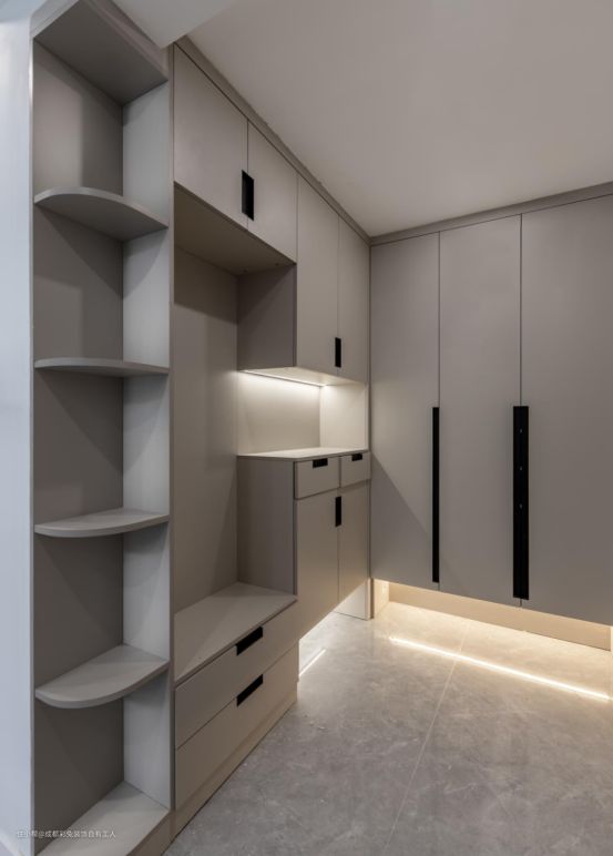 底部悬空的设计是现代玄关鞋柜中颇具时尚感的设计元素。通过悬空的底部,不仅增加了整体空间的轻盈感,还为清理卫生提供了便利。底部的悬空设计使整个玄关区域更加通风,为居室注入了一份空灵的美感。