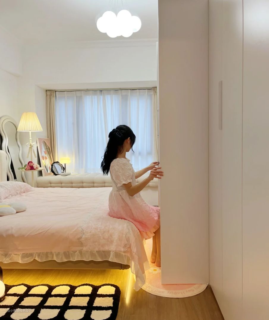 网友@伊莱文文:卧室面积仅有10㎡,但还是想要一个衣帽间,所以就在进门处抠出了一个长1.57m*宽1.01m的空间来做衣帽间。