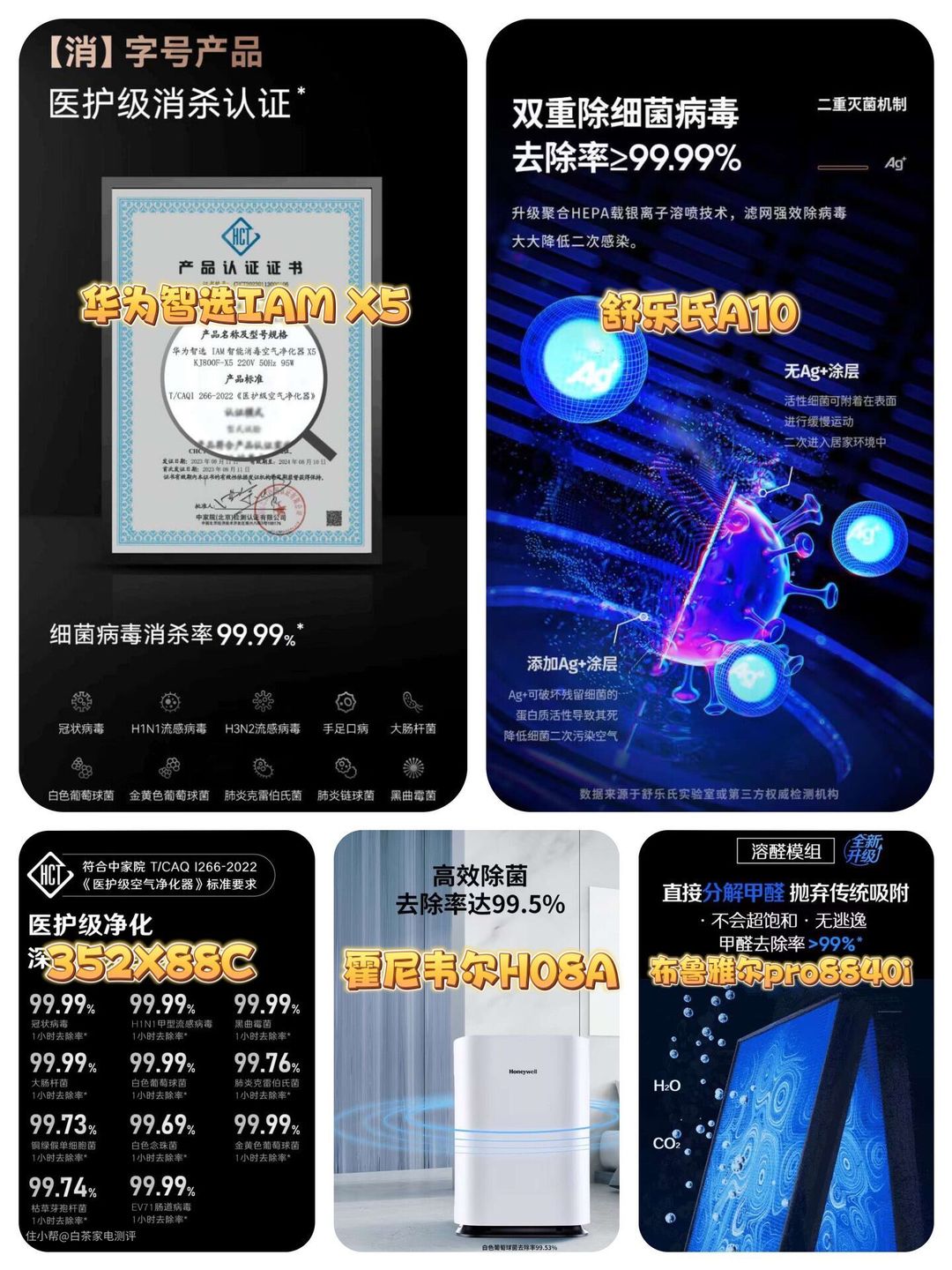 华为智选IAM X5通过了国家卫健委员最严格的“消”字号备案,还有十多项权威机构的检测报告,是这五款同等价位的空气净化器产品中净化标准最高、最严格的一个。