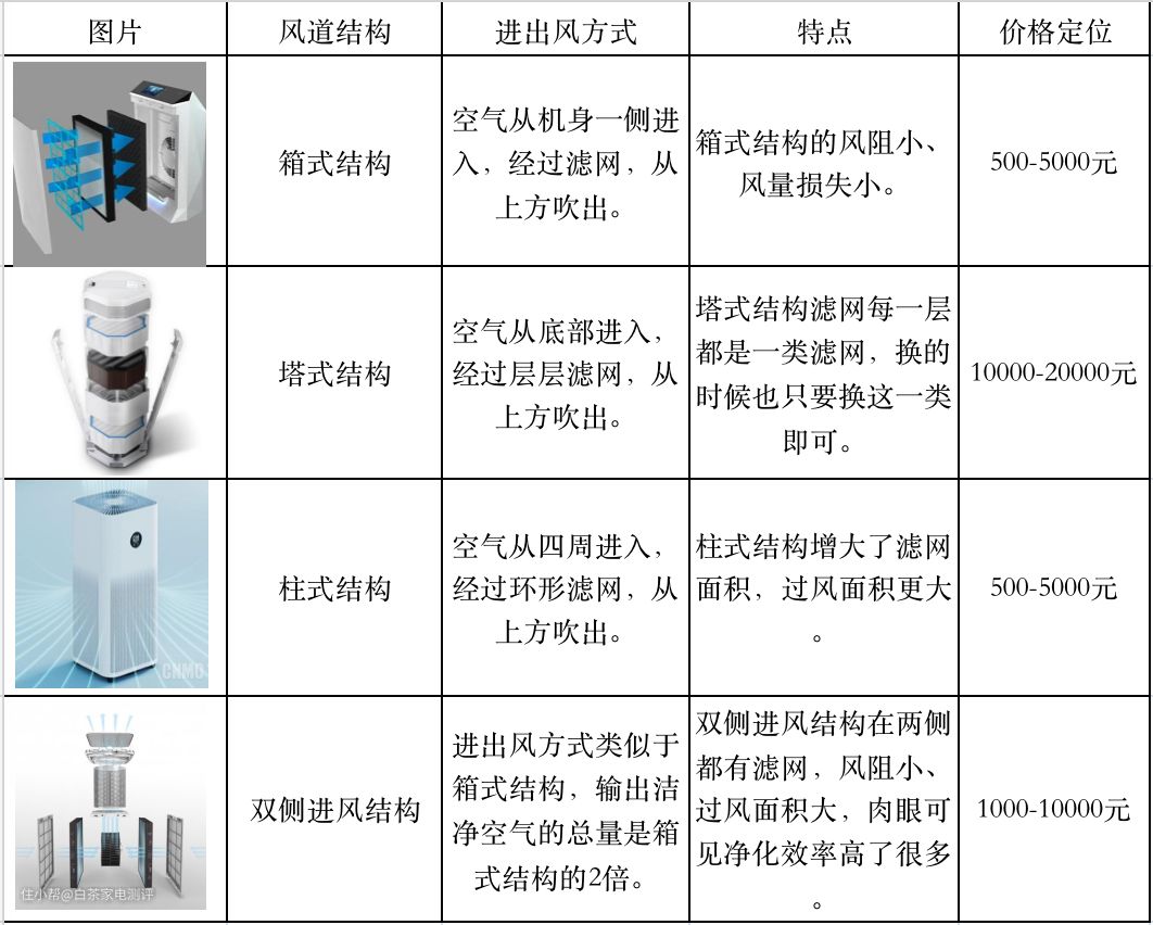 空气净化器可以根据风道设计的不同大概可以分为这几类:塔式、双侧进出风、柱式结构、箱式结构。这里白茶给大家整理一下各款净化器的不同: