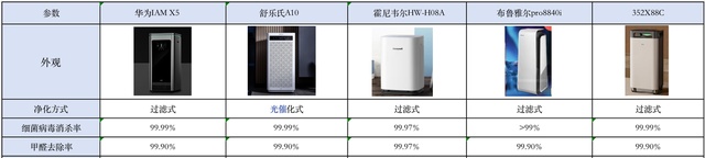 结合滤网结构和配置组成,每一款的消杀率都在99%以上,可以说消除细菌病毒、甲醛的效果都很不错。具体到消杀率数据上,华为IAM X5、舒乐氏A10、352X88C这三款表现更好一些。