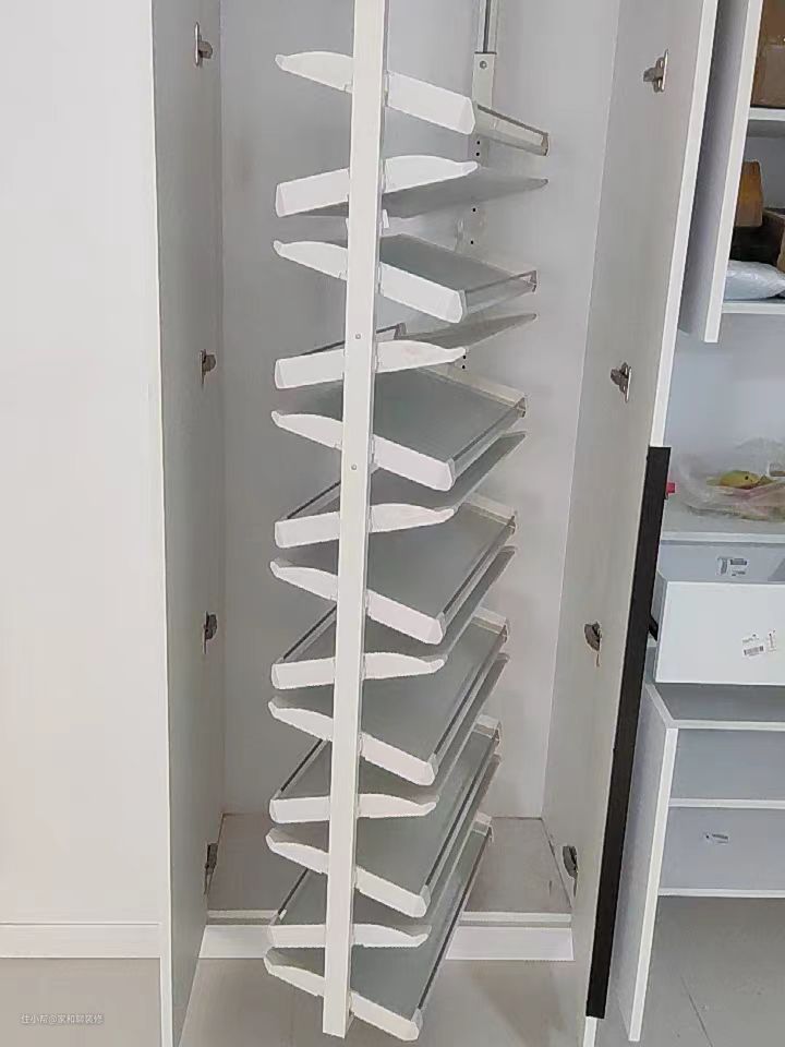 除了传统的鞋柜设计外,还可以利用这种旋转的五金配件增加鞋子的收纳空间,比传统鞋柜多装将近一倍的鞋子量,使用起来也非常方便省事,一拉一转一推就搞定。