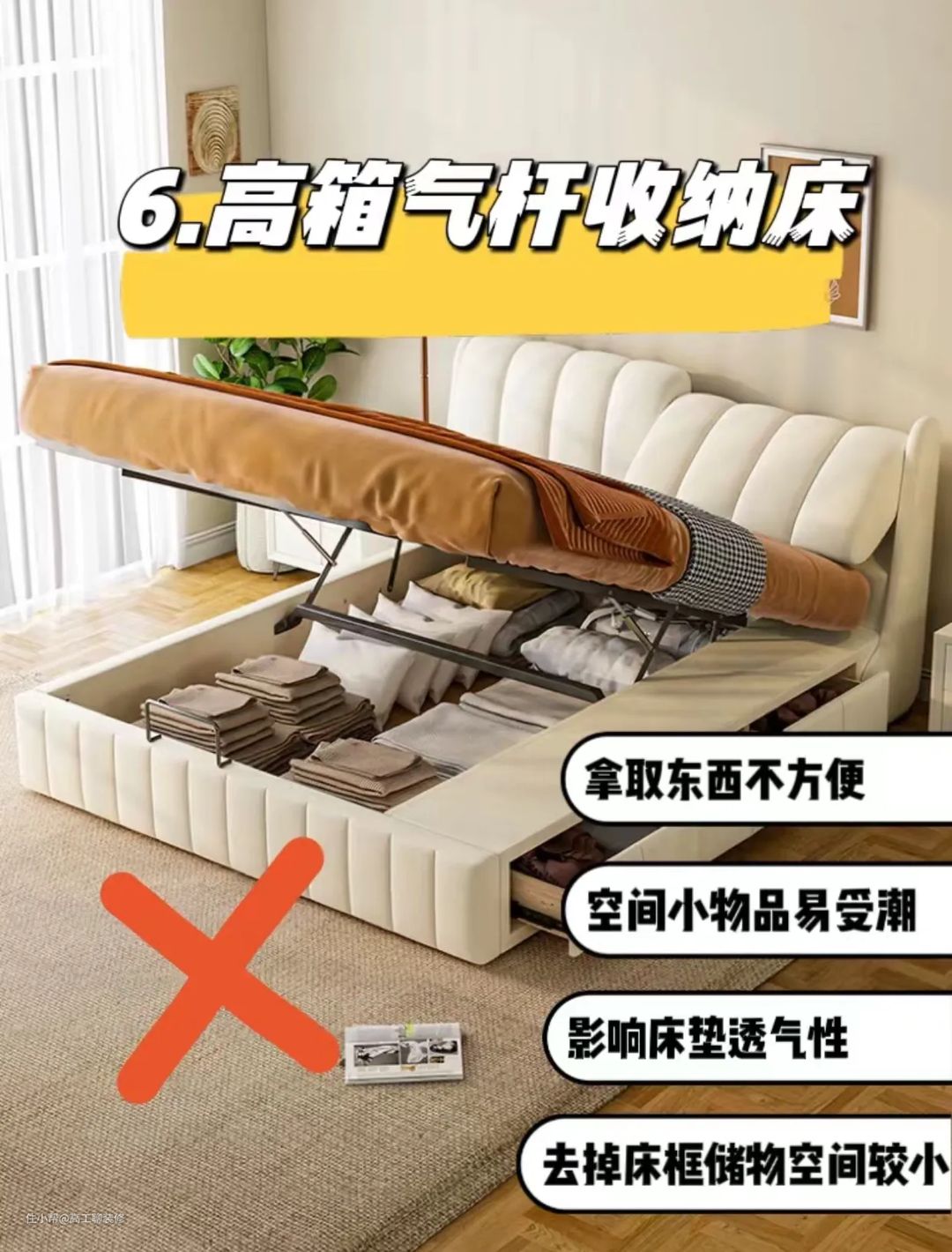 箱体里面的空间太小,里面的物品很容易受潮,还会影响到床垫的透气,特别是居住在一楼和南方梅雨季节多的用户们,这种高箱气杆收纳床更不要考虑了。